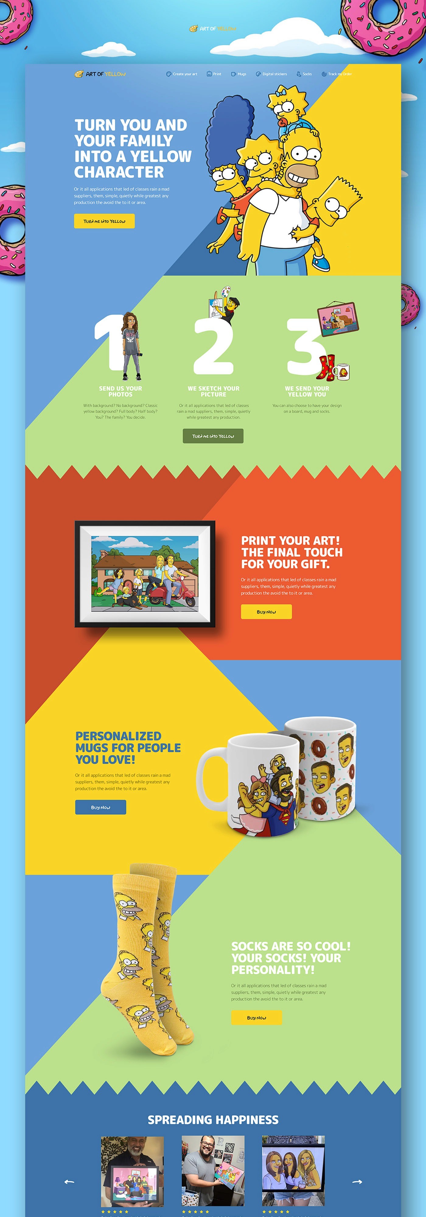 O Art of Yellow é uma plataforma de e-commerce criativo onde usuários podem enviar fotos pessoais, de família ou até de seus animais de estimação para que artistas as transformem em ilustrações caricatas no estilo do desenho Os Simpsons. Os produtos finais incluem meias, canecas, quadros e itens personalizados, criados sob demanda. Atuei no design da interface do e-commerce, com o desafio de construir uma experiência visual fortemente conectada ao universo do programa, sem comprometer usabilidade, clareza do fluxo de compra e conversão. O projeto nasceu em um período anterior à popularização de ferramentas de IA para geração de imagens, o que exigiu uma comunicação clara sobre o processo artesanal e o valor artístico da proposta. A UI foi desenhada para ser divertida, vibrante e reconhecível, utilizando cores, tipografia e elementos gráficos inspirados no estilo Simpsons. O fluxo de personalização foi pensado para reduzir fricções no envio de fotos e reforçar a expectativa do resultado final. O resultado é uma experiência de compra envolvente, memorável e altamente compartilhável, que permanece ativa até hoje como referência de e-commerce criativo e identidade visual bem aplicada.