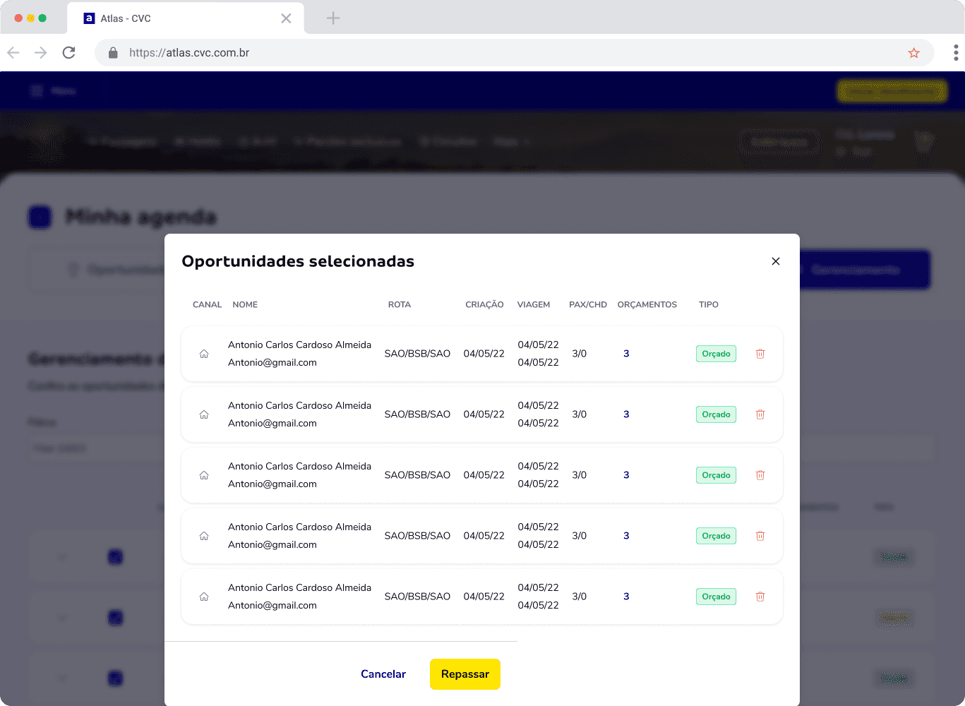 Os participantes foram convidados a completar uma série de tarefas específicas para simular o uso da plataforma: Encontrar uma oportunidade de vendas: Navegar pelo sistema para identificar leads potenciais. Entrar em contato com um lead: Utilizar a plataforma para enviar uma mensagem ou iniciar uma conversa. Consultar os detalhes de uma reserva de viagem: Acessar informações sobre um pacote específico e seus detalhes. Finalizar a venda: Completar o processo de venda e verificar se a confirmação foi bem-sucedida.